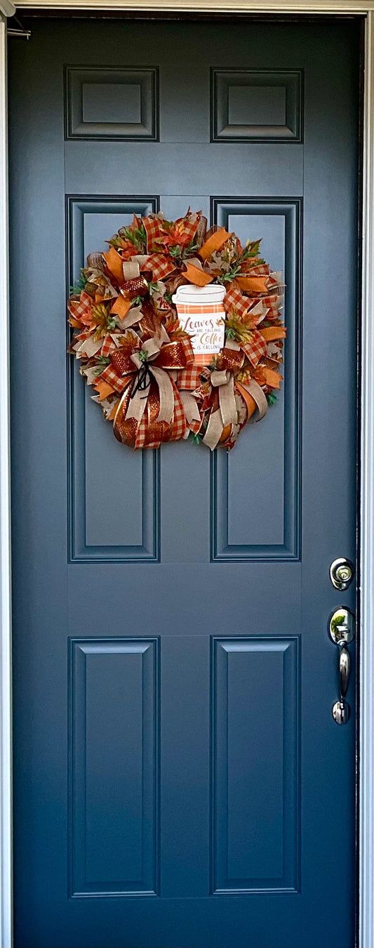 Fall Autumn Harvest and Leaves Wreath for Front Door, Leaves and Coffee, Welcome Wreath for Front Door, Fall Door Decor Thanksgiving Wreath