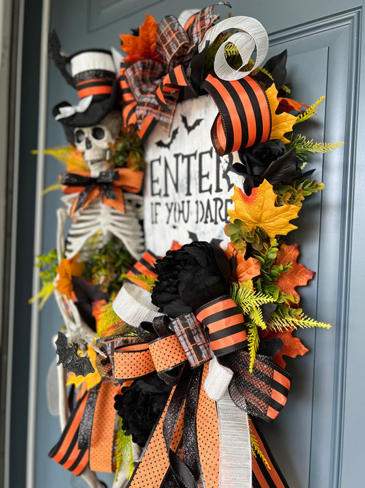 Halloween Wreath for Front Door, Skeleton Wreath for Front Door, Halloween Wreath, Haunted House Decor Enter if You Dare, Gothic Wreath