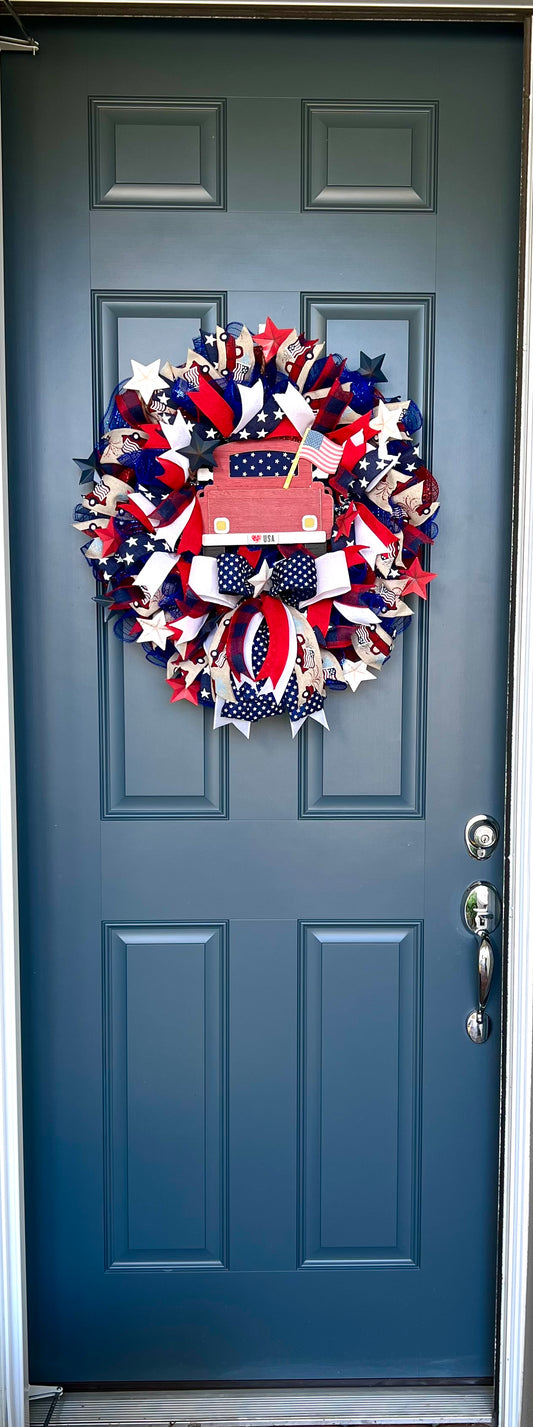 Patriotic Memorial Day Red Truck Wreath for Front Door, Red White Blue Fourth of July USA Wreath, Welcome Home Armed Forces Military Wreath