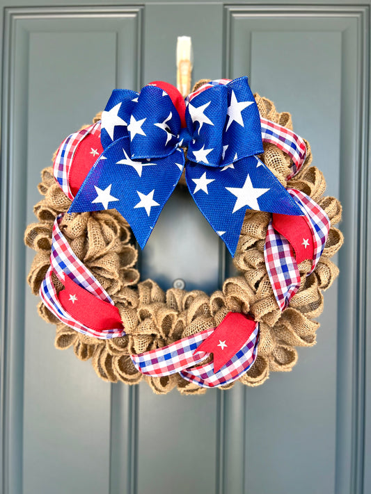 Patriotic Memorial Day Burlap Stars Americana Wreath for Front Door, Red White Blue Fourth of July USA Welcome Home Veterans Day