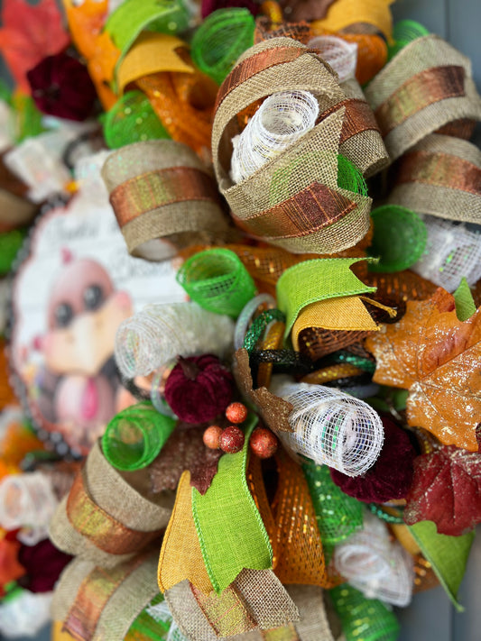 Thanksgiving Fall Harvest Autumn Turkey Wreath for front Door Autumn Fall Home Decoration Thankful and Blessed Pouf Designs by Valerie