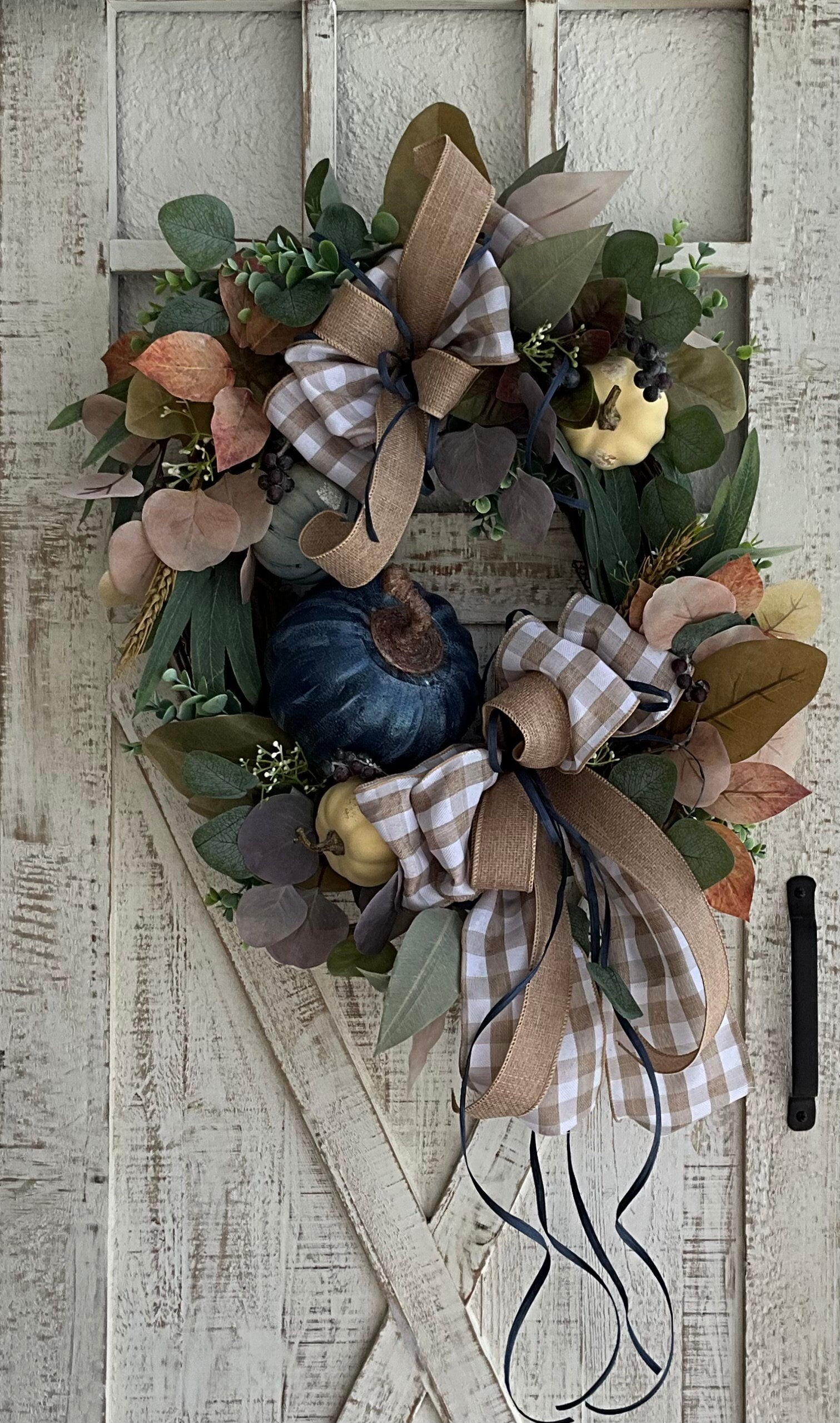 This elegant, rustic pumpkin wreath for fall or Thanksgiving would look stunning on any front door, porch wall or indoor wall. It was professionally constructed in my pet-free, smoke-free home.