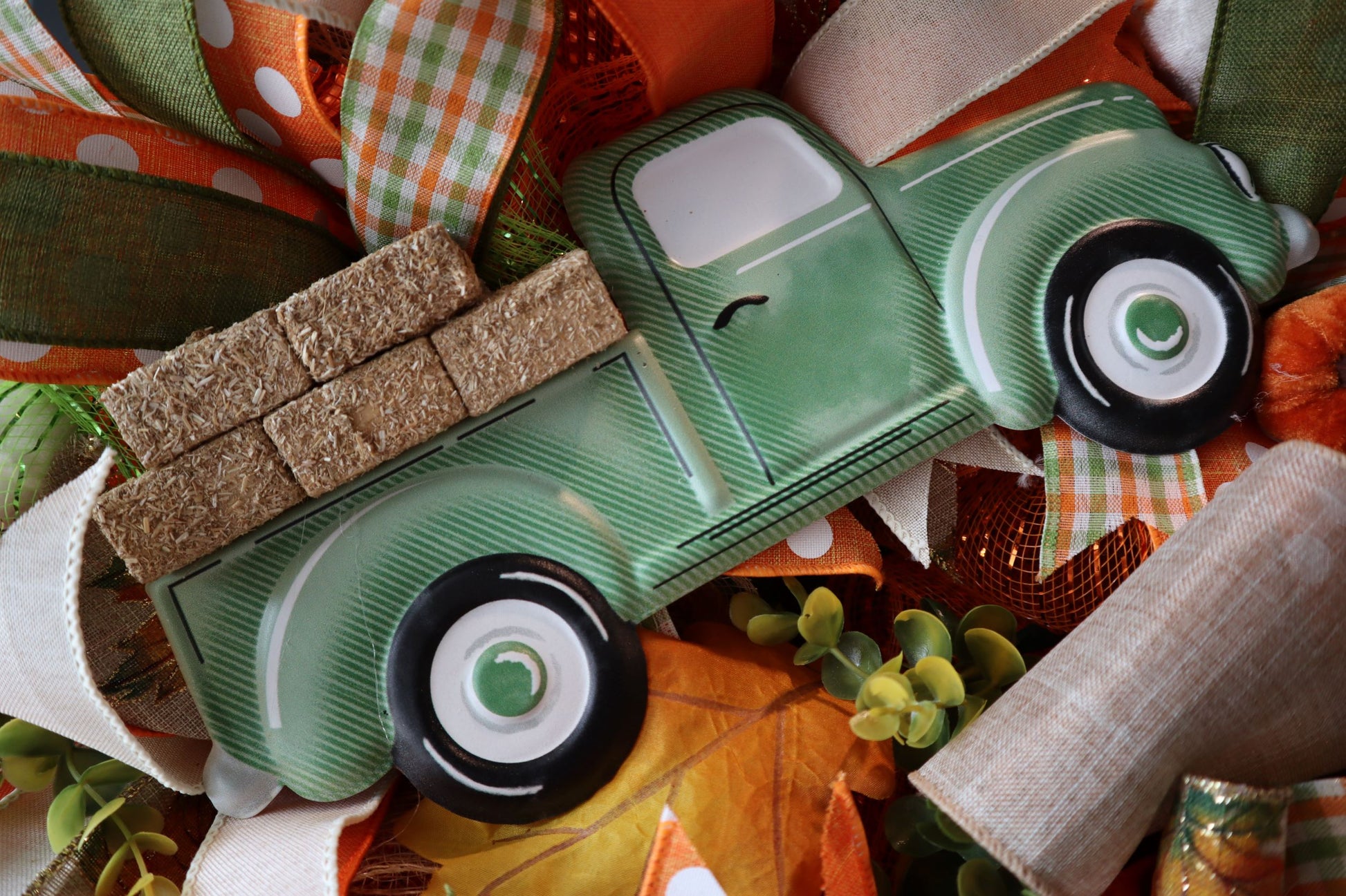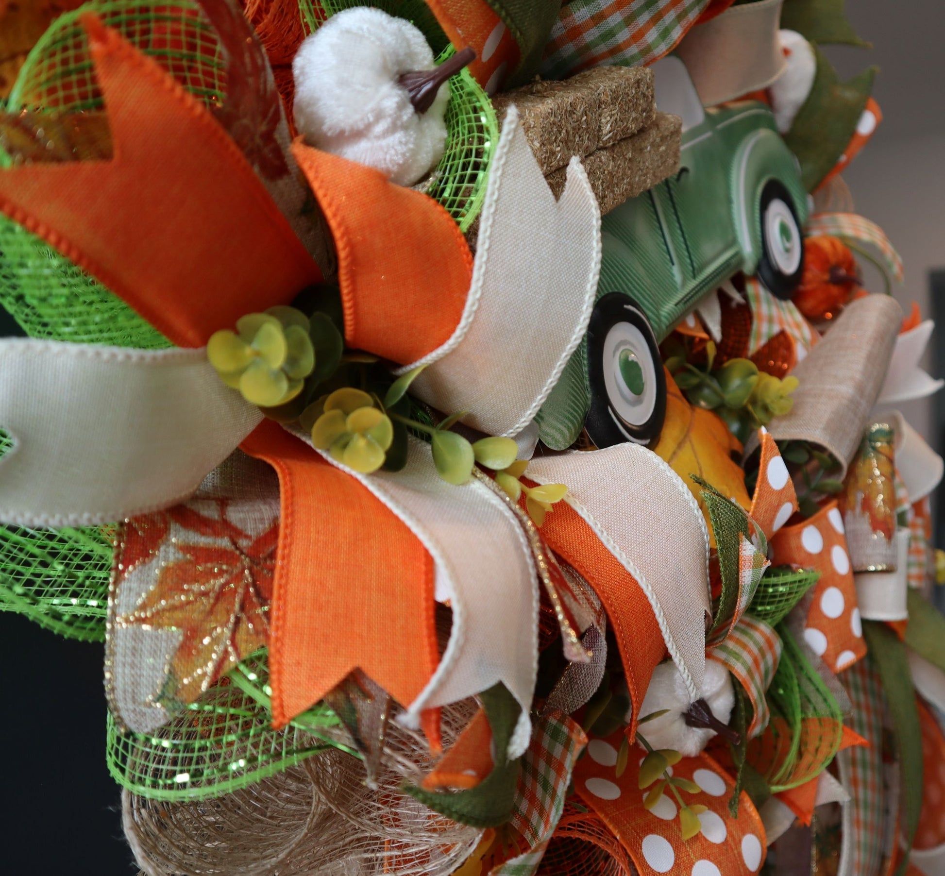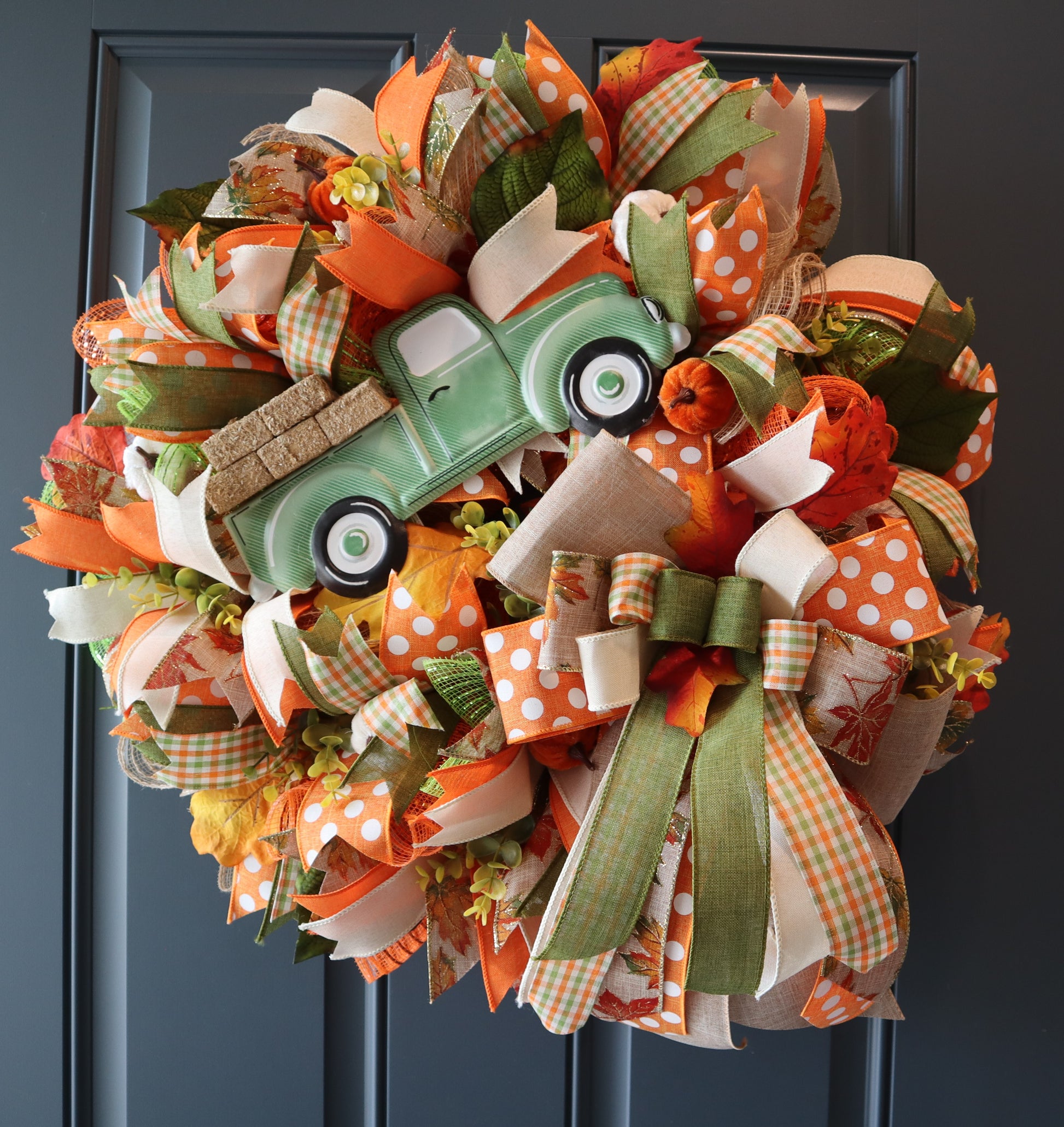 This Fall wreath includes moss green, check, orange and many other colors. It is made on a wire base with premium deco mesh and many other items. Among the beautiful premium ribbons are tiny pumpkins, leaves and greenery to add fullness and body to wreath. Attached to this wreath is a super-cute metal truck where miniature hay bales have been stacked in the truck bed. Also attached is a farm-house style bow that adds to the character of the wreath. A corded wreath hanger has been added for placement on your door.