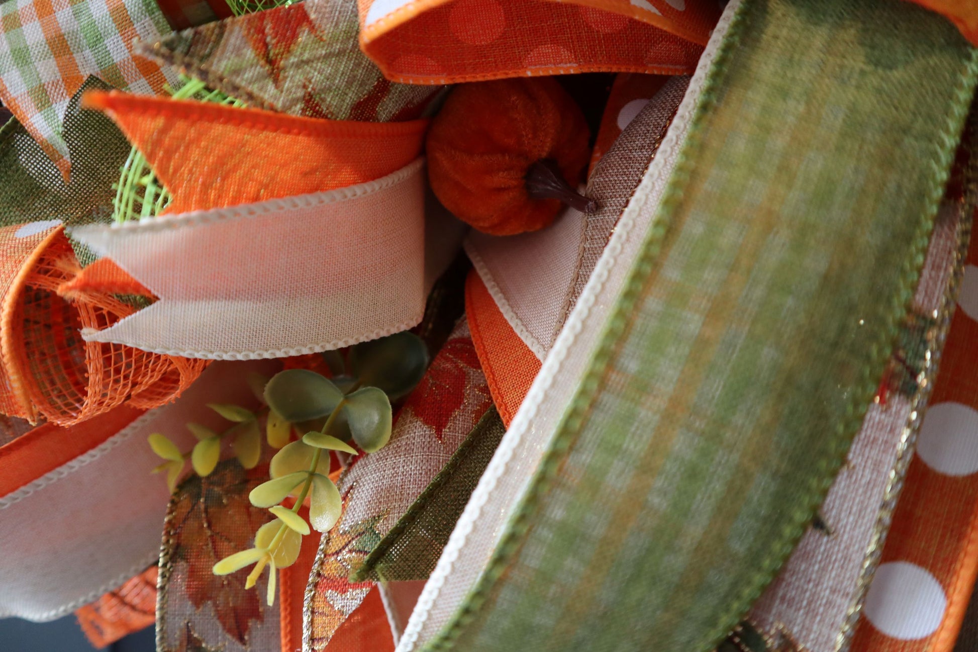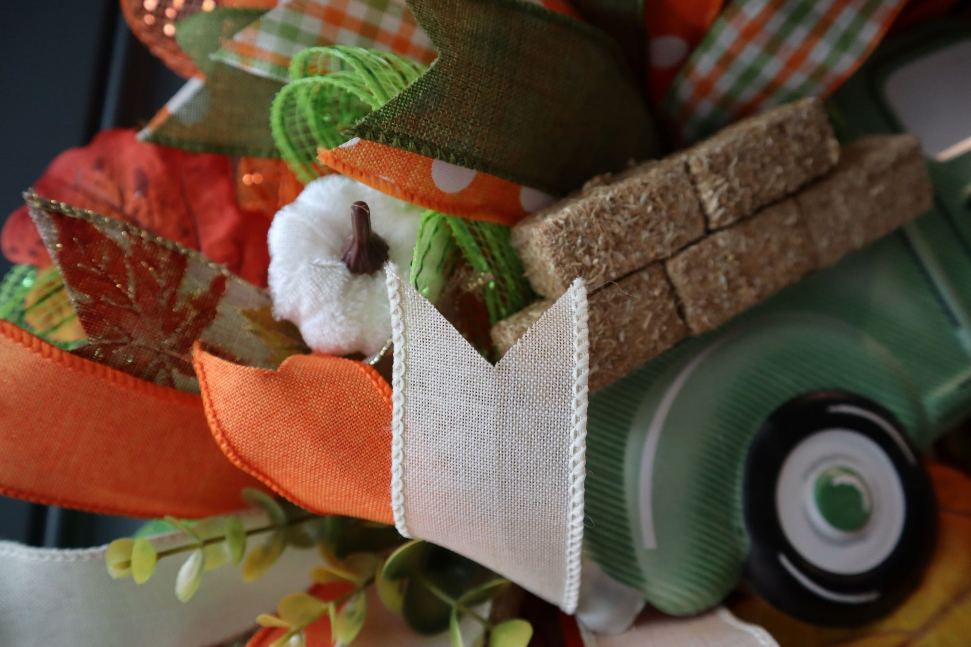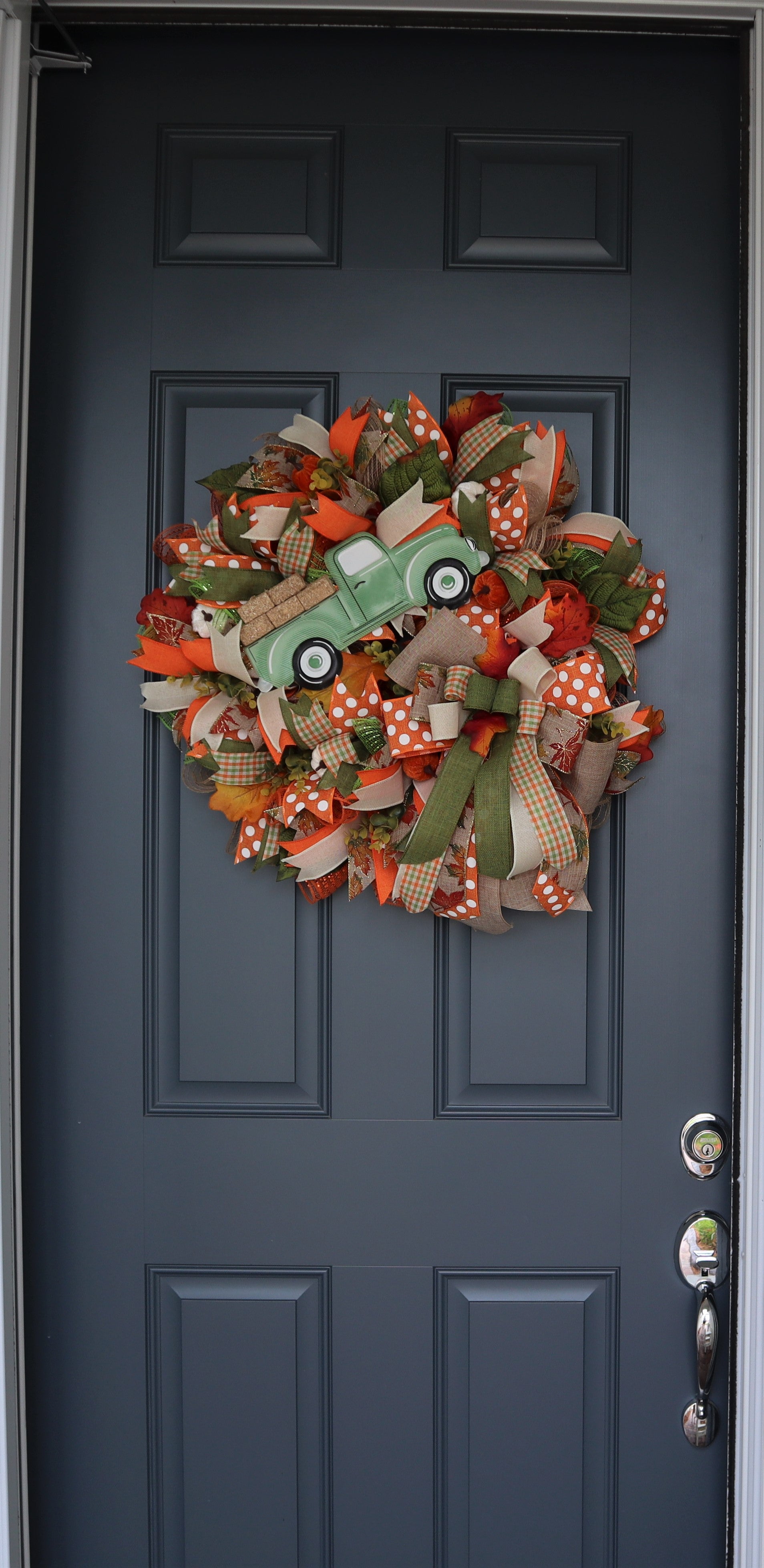 This Fall wreath includes moss green, check, orange and many other colors. It is made on a wire base with premium deco mesh and many other items. Among the beautiful premium ribbons are tiny pumpkins, leaves and greenery to add fullness and body to wreath. Attached to this wreath is a super-cute metal truck where miniature hay bales have been stacked in the truck bed. Also attached is a farm-house style bow that adds to the character of the wreath. A corded wreath hanger has been added for placement on your door.