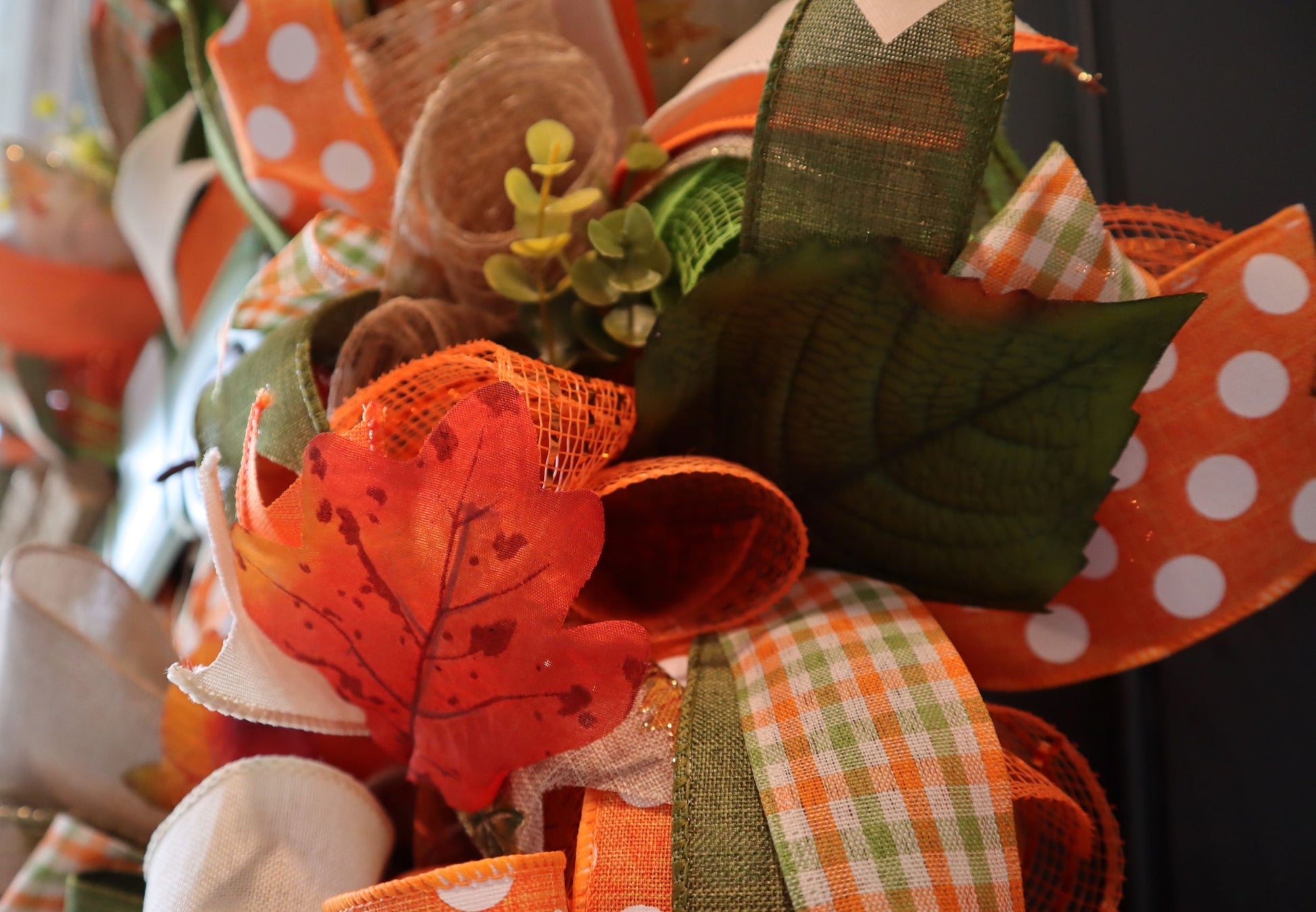 This gorgeous Fall or Autumn wreath was made with many bright colors of Fall. It would look beautiful on your front door, porch wall or above a fireplace and would even be a wonderful housewarming gift.