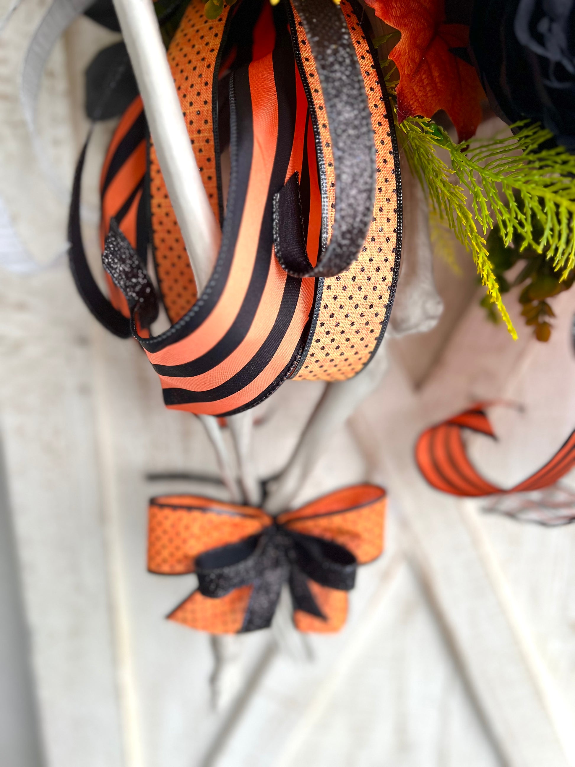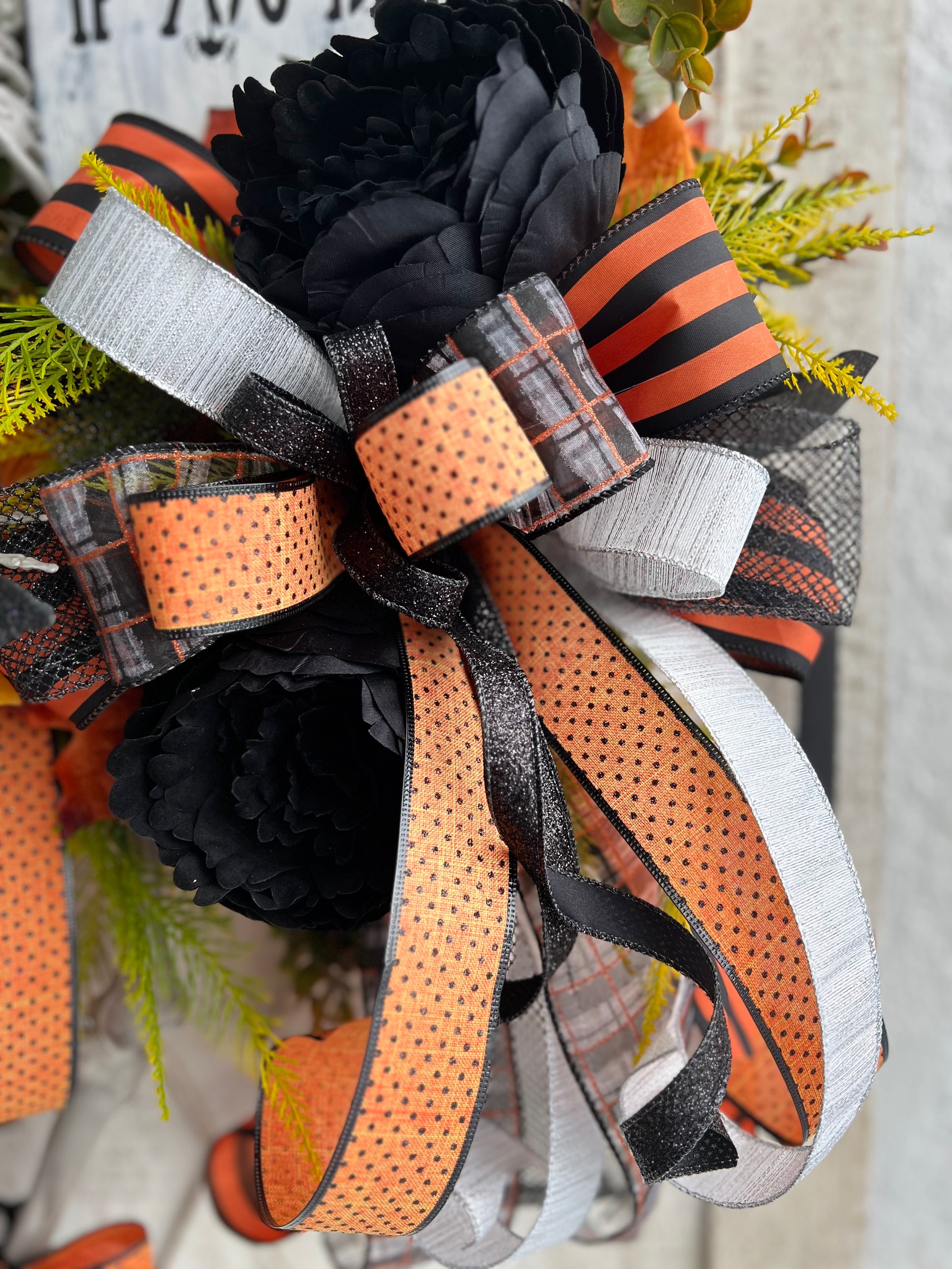 This Wreath measures approximately 19” across x 31” up and down x 7” deep (measurements were taken from the tip of top hat to the bottom of the ribbon tails. The legs of the skeleton can be posed or left hanging; if left hanging, the up and down measurement is greater) and is constructed with artificial flowers, artificial greenery, artificial embellishments, wired ribbon, hot glue, chenille stems, floral picks, floral tape, floral moss, wire, a top hat hand made by me, a wood sign constructed and painted by me, and a grapevine wreath base.
