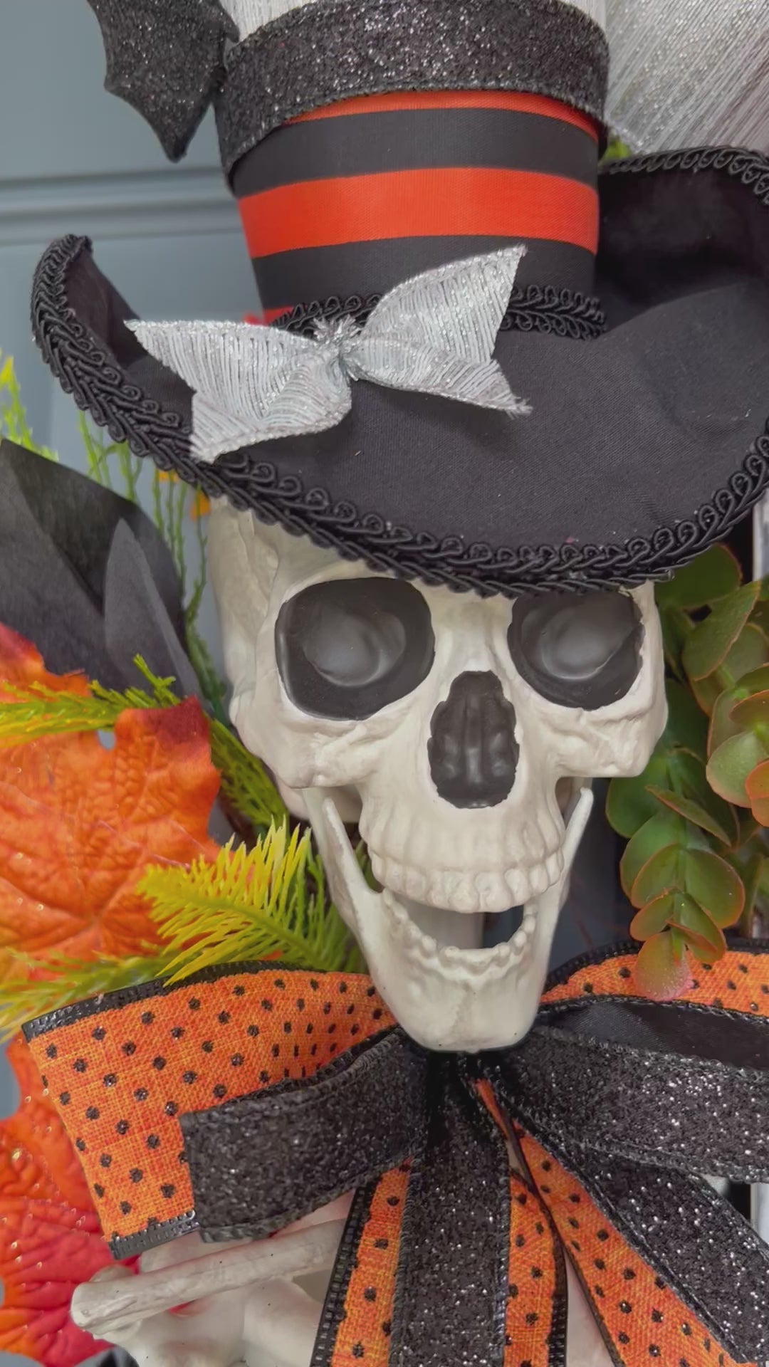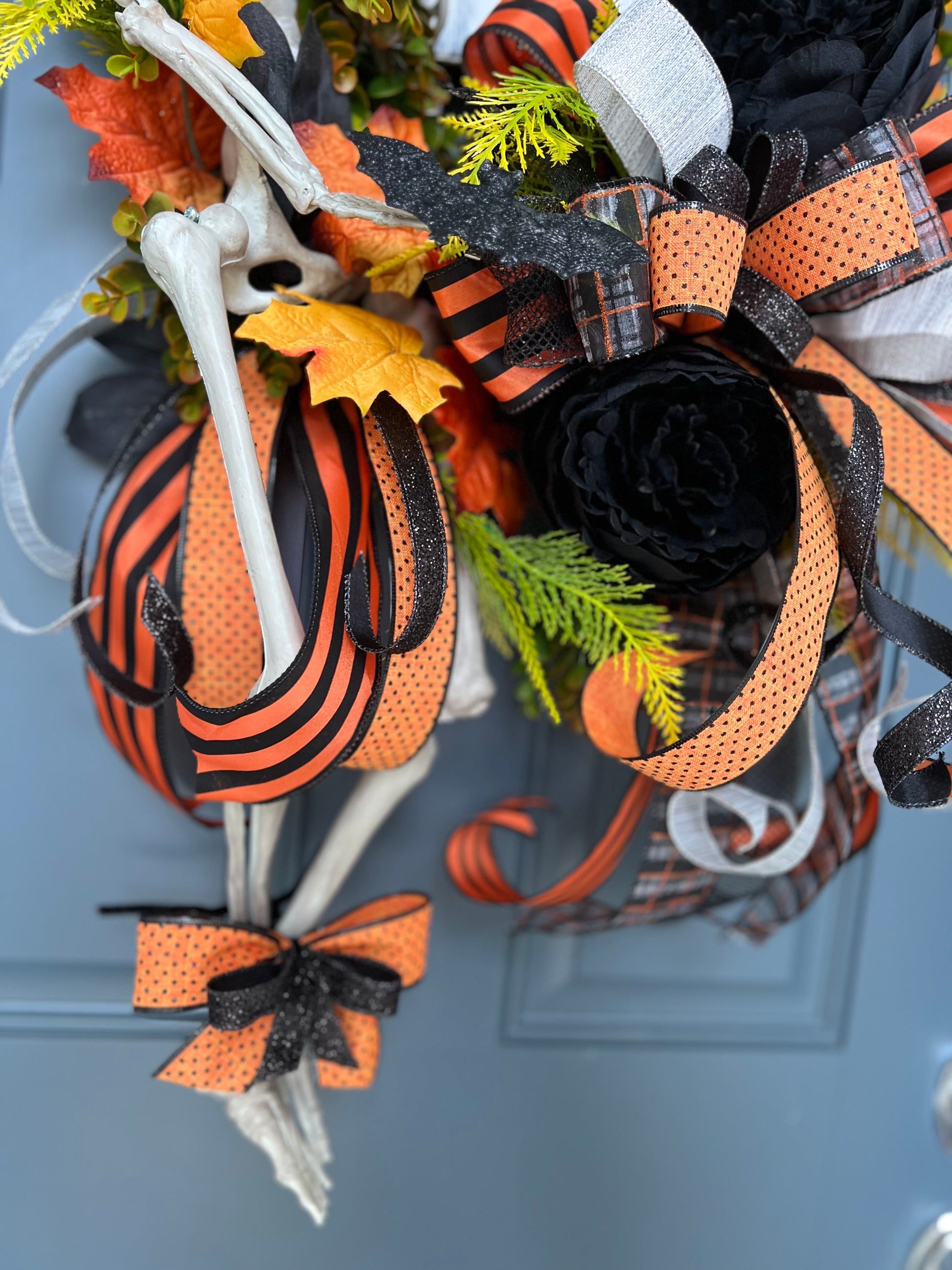 This gorgeous and lush skeleton wreath would look stunning on any front door, porch wall or indoor wall.