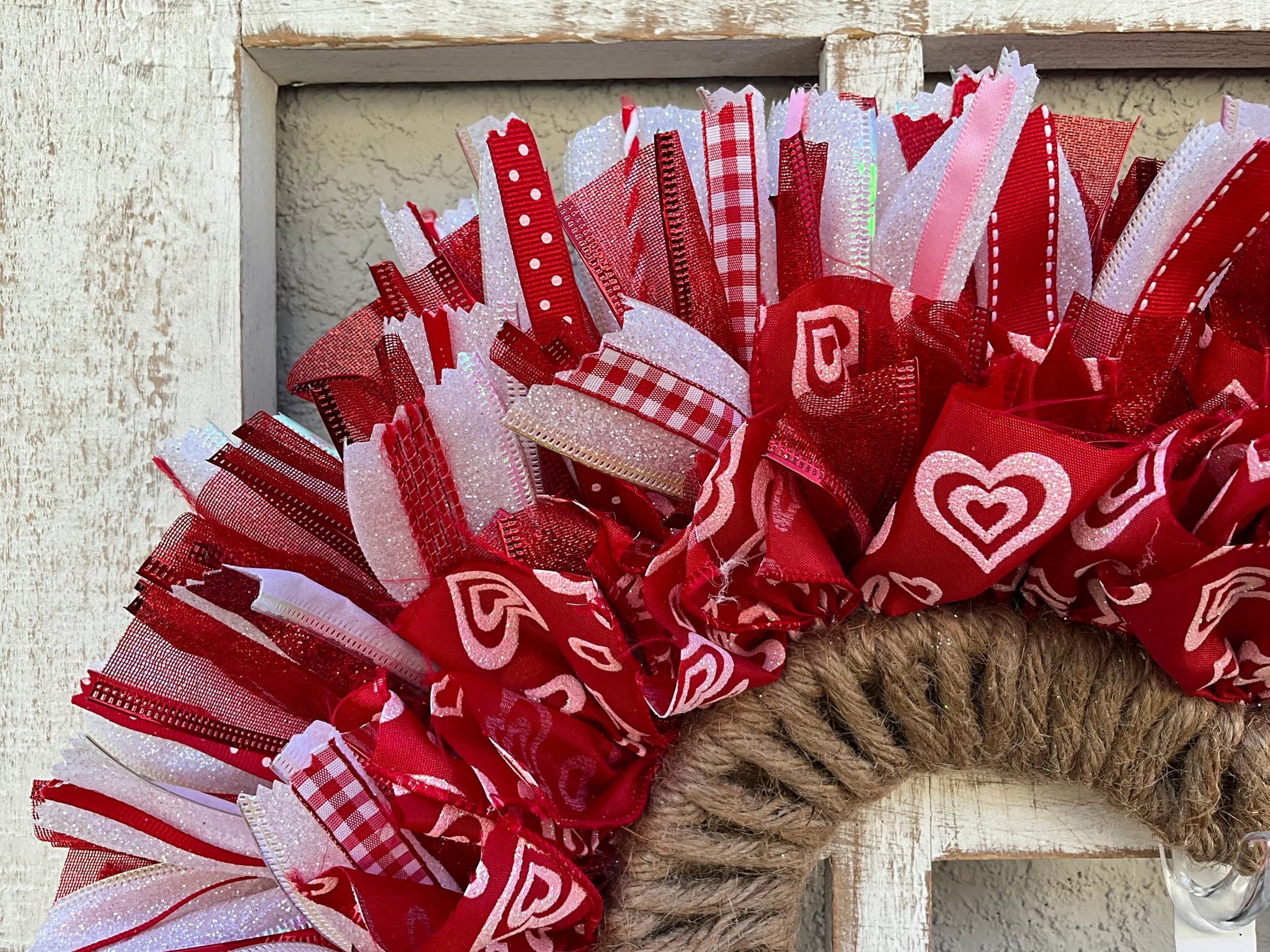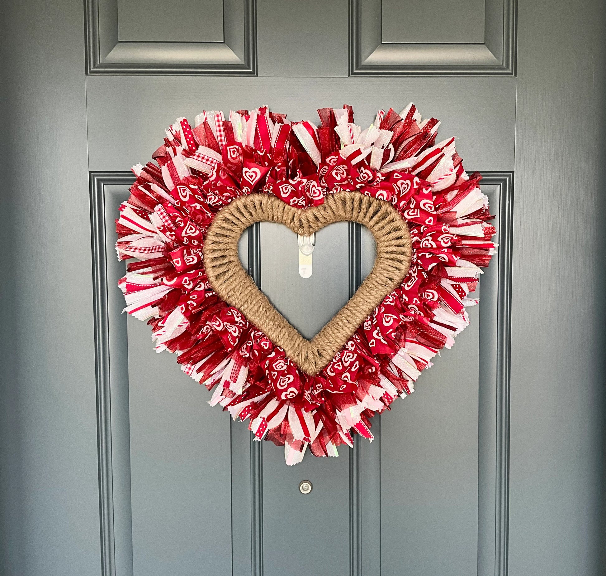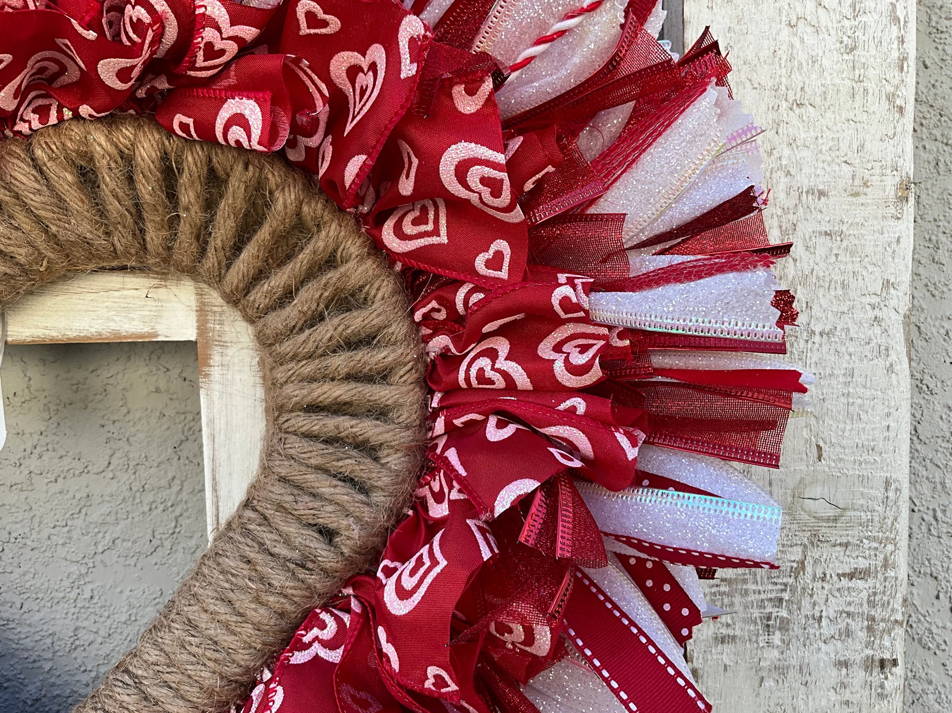 Looking for the perfect fun design for your door for any occasion or for a gift? This Heart wreath includes many yards of non-wired and wired ribbon, a metal frame, jute rope and hot glue.