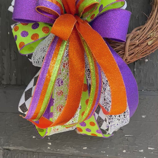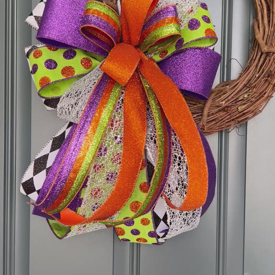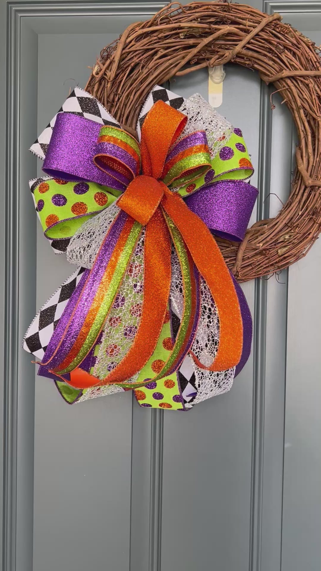 🎃 / Add a colorful and sparkly Halloween decoration to your special occasion with this Extra Loopy Halloween Bow. This celebratory bow will bring pizazz to your October 31 decor and would look amazing on any type of wreath base, lantern, carriage light, garage light, Autumn or Fall decor, door or any place you wish to place it. NOTE: this listing includes the bow only and DOES NOT include the wreath shown in one of the photos.