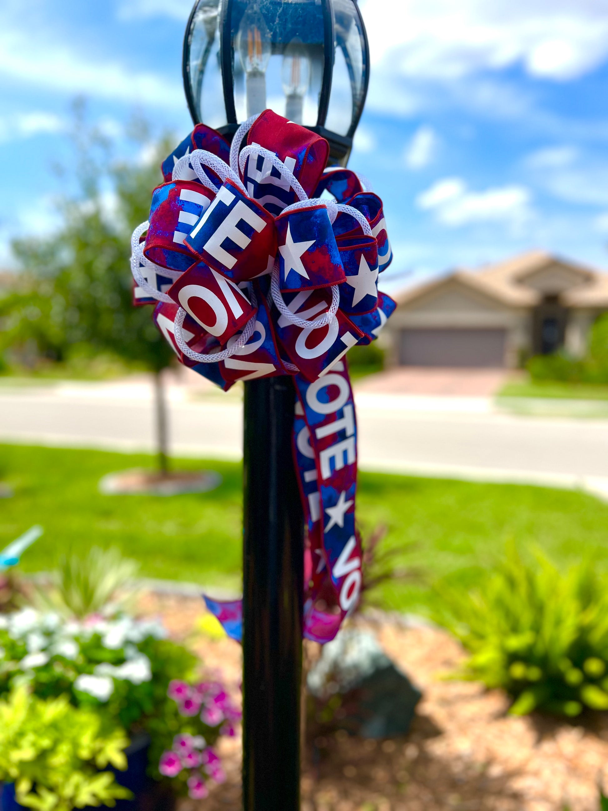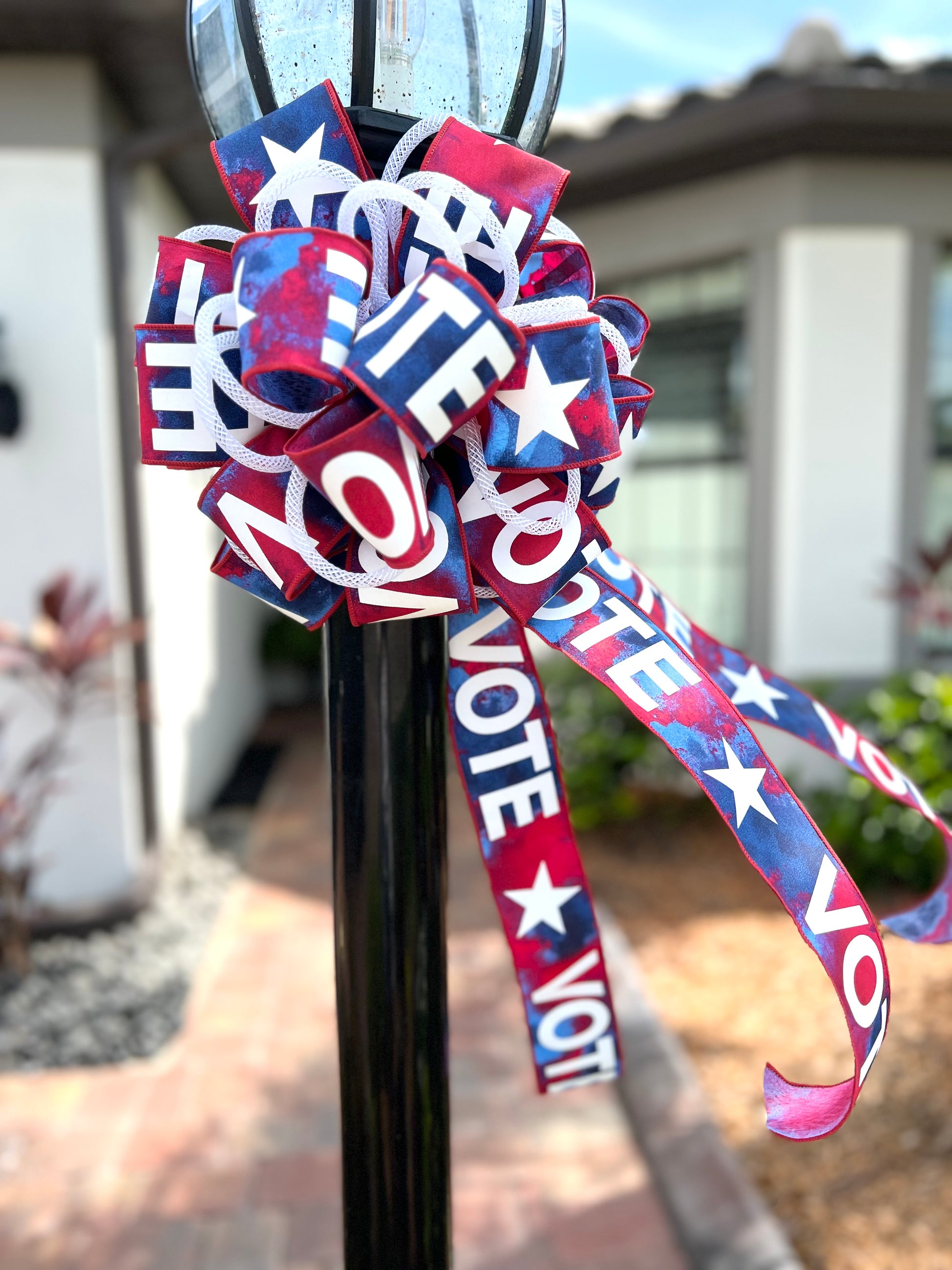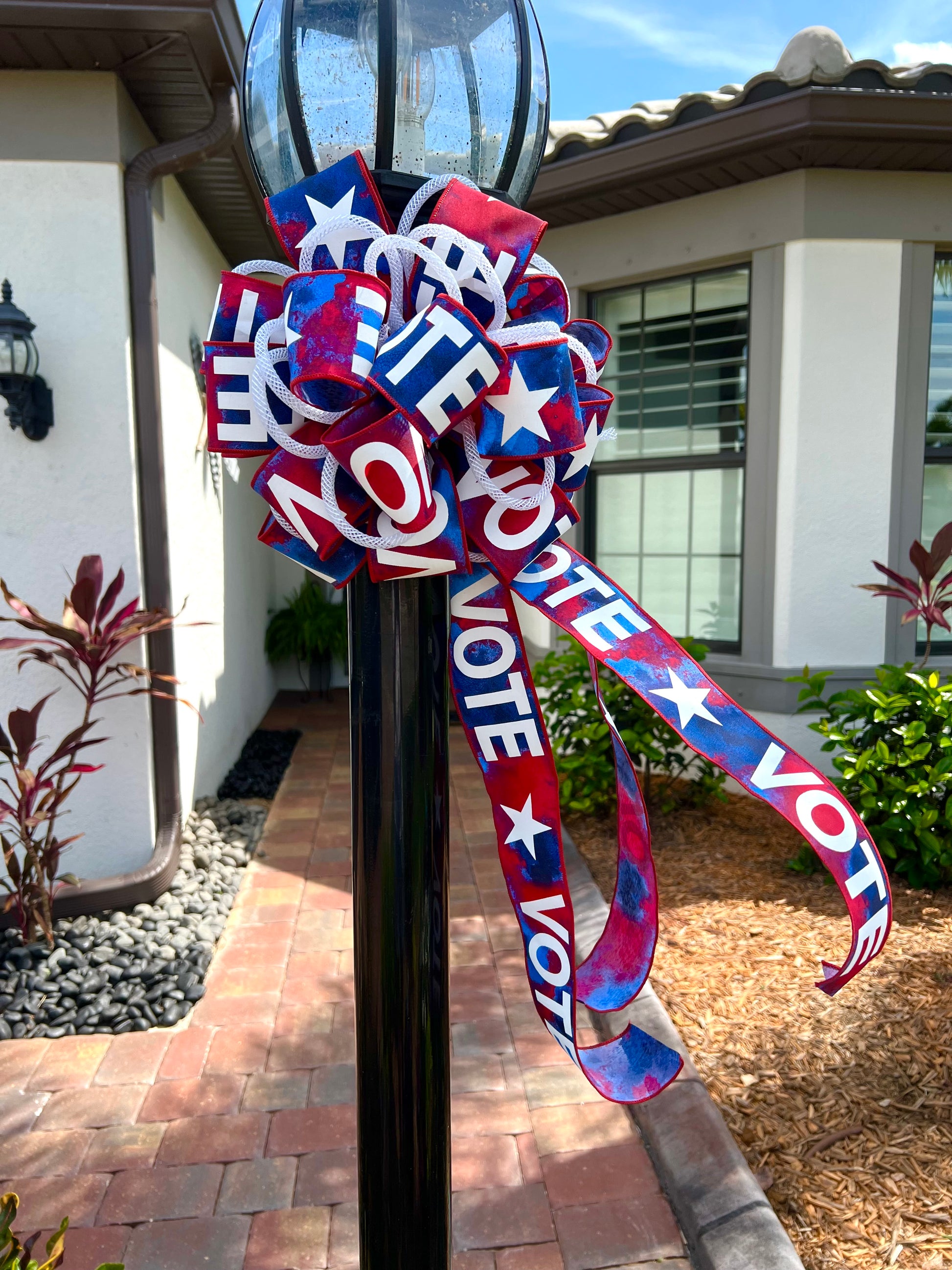 Your red, white and blue “Vote” bow will look stunning for any election party or to adorn your front door, lamp post, tree, fence, banister, wreath, etc.