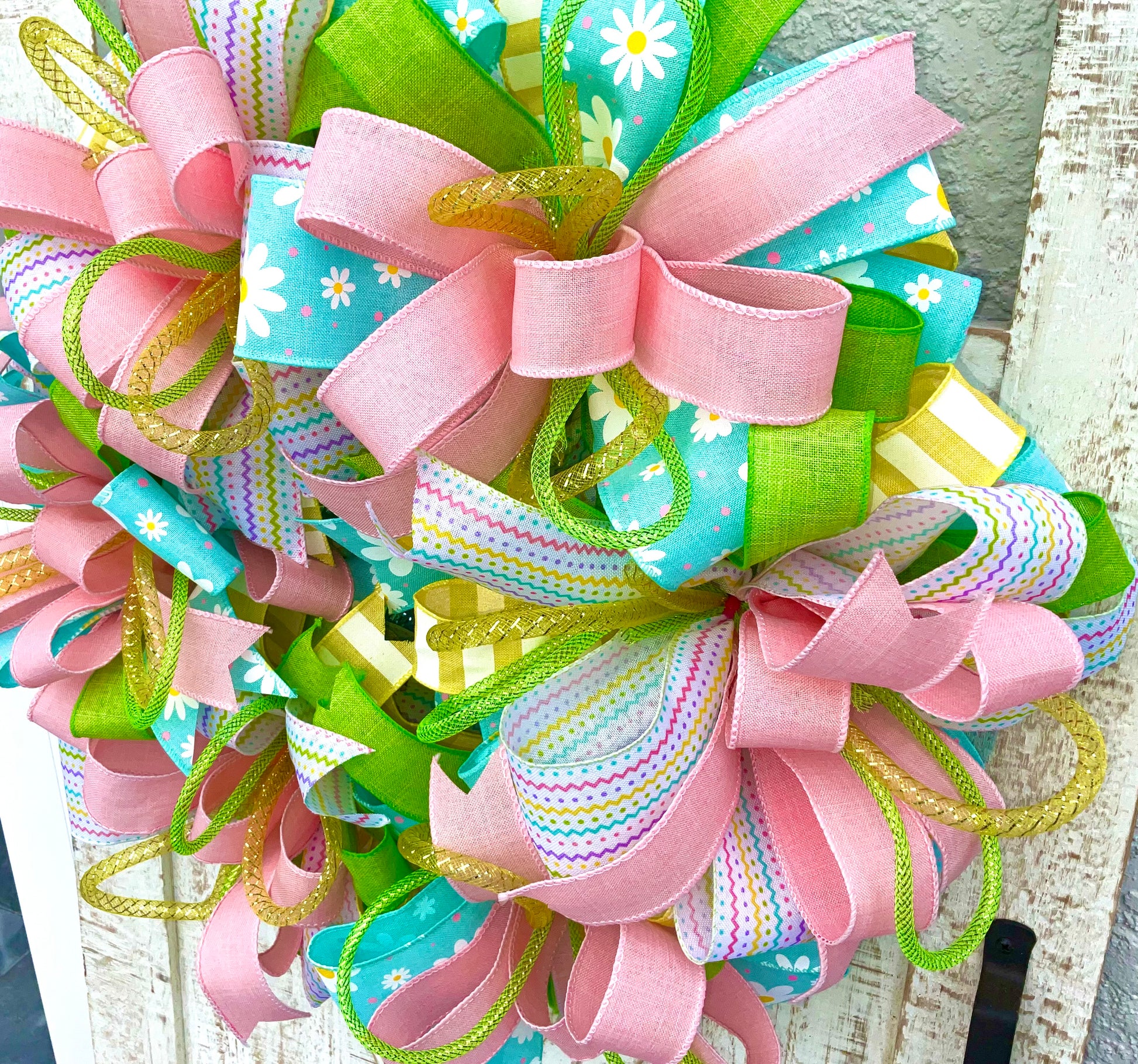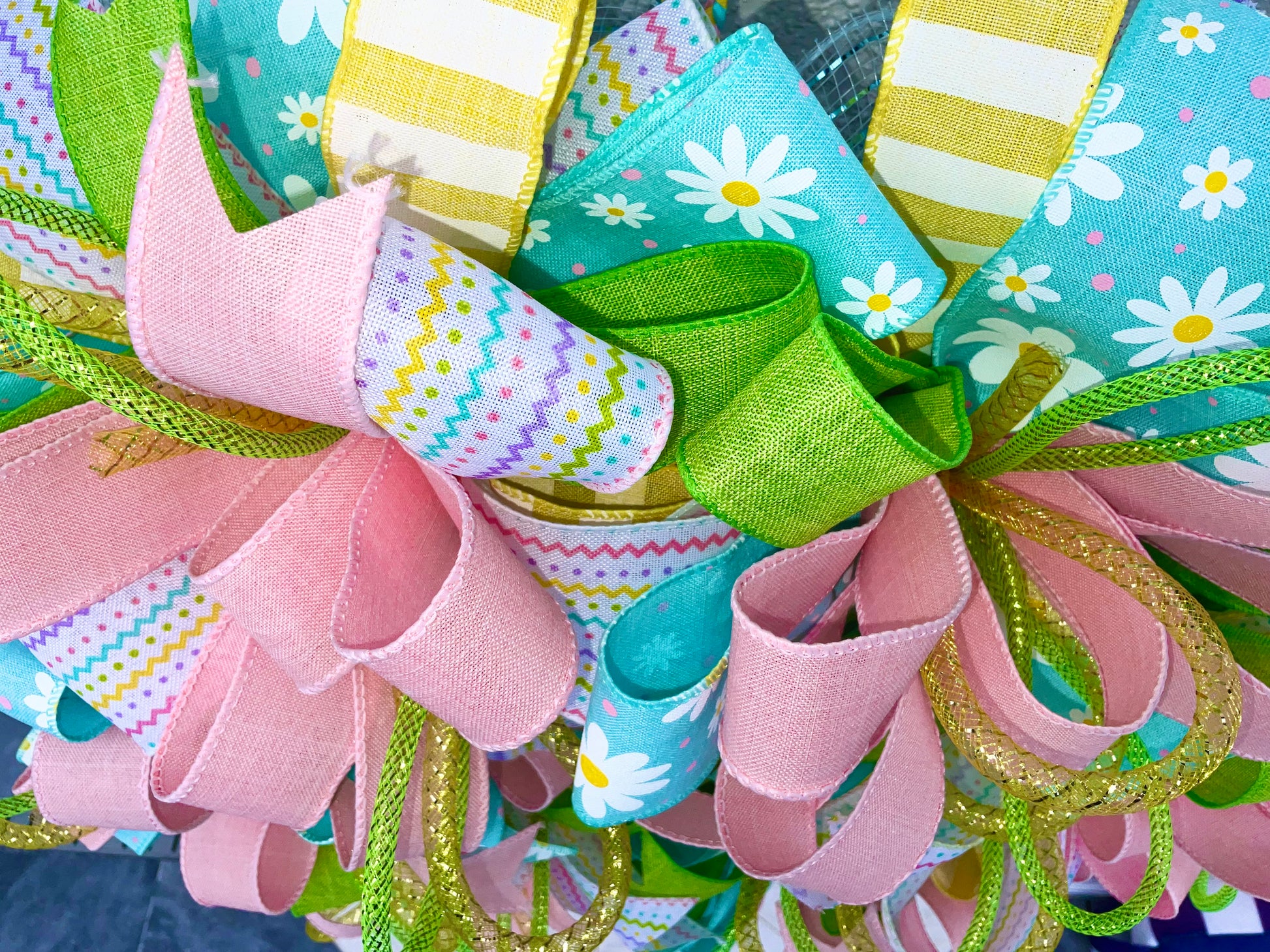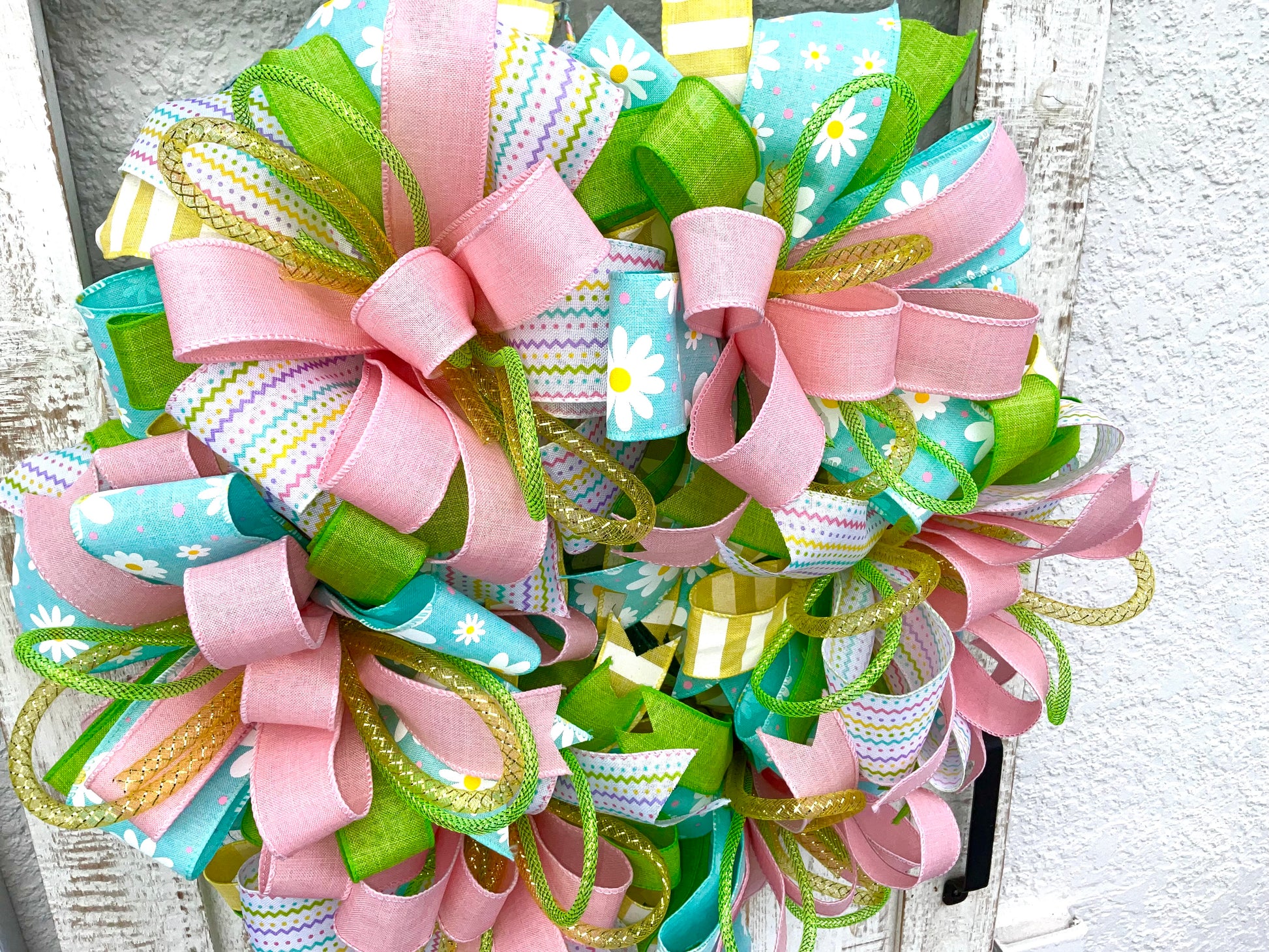 This whimsical lush Spring wreath or Easter wreath with beautiful wired ribbon is a great gift for mom or a gift for friend and would look amazing on any front door, porch or wall.