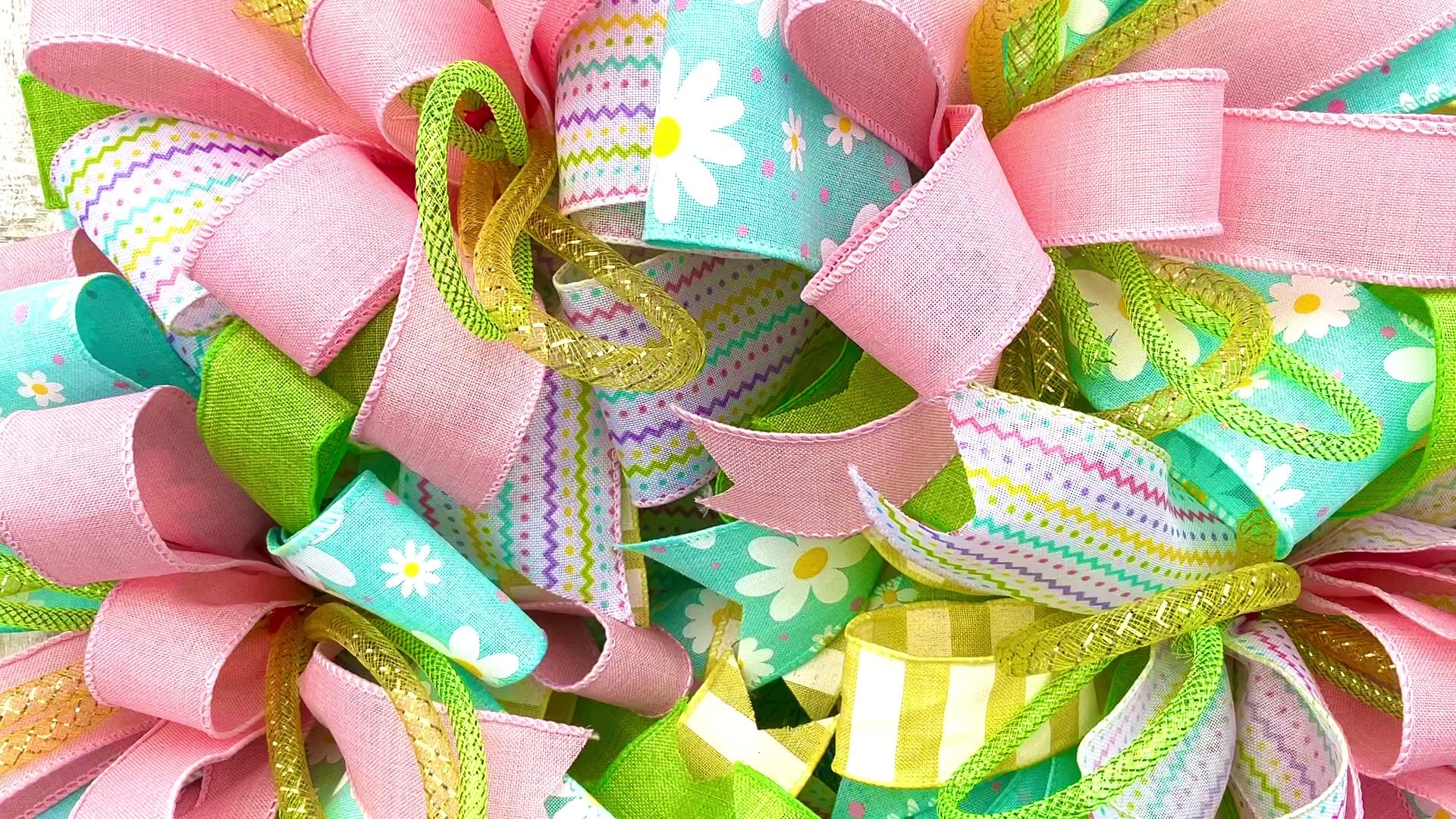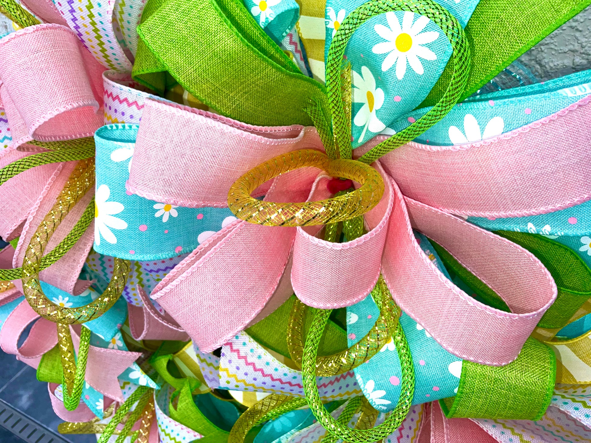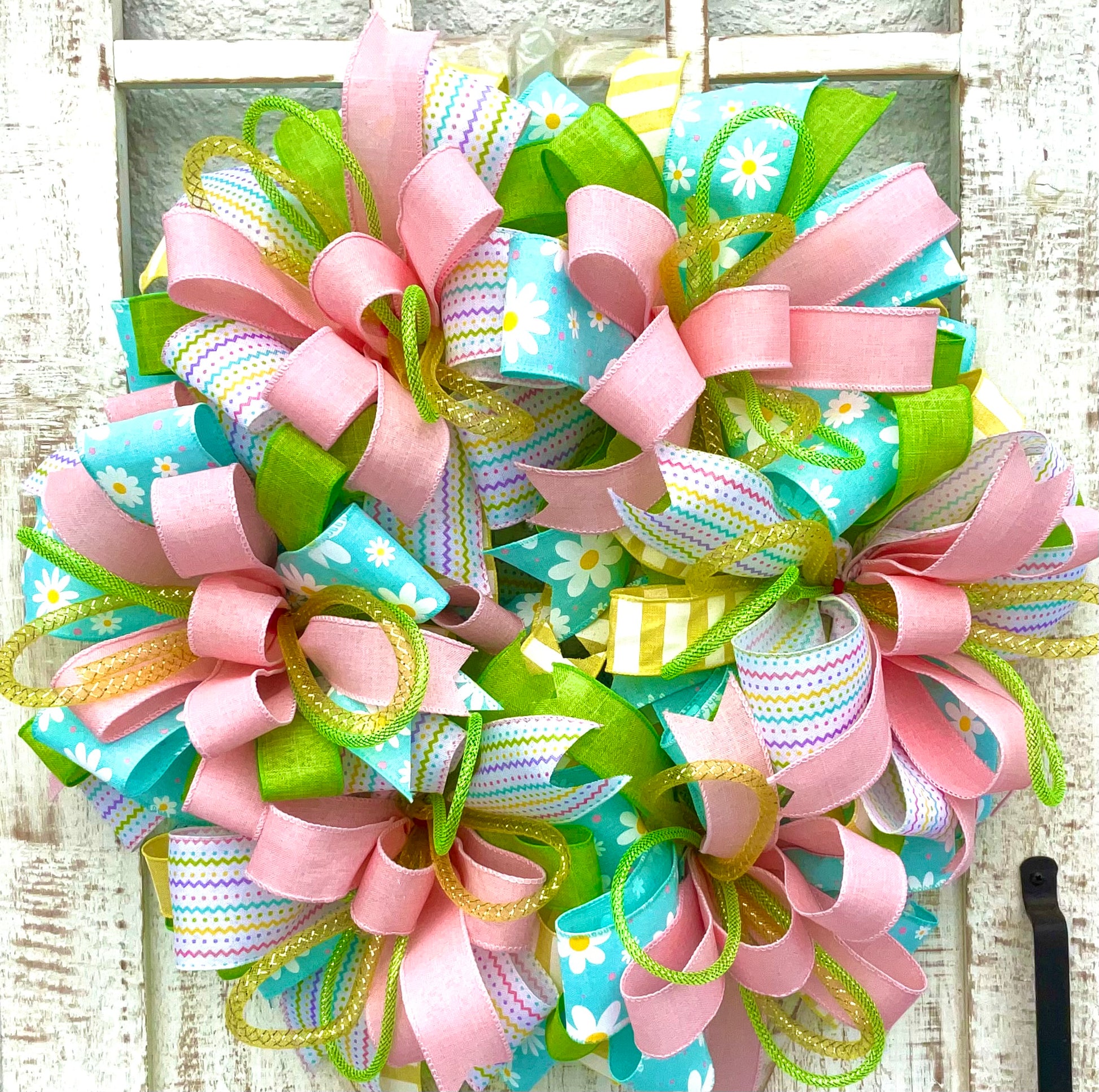 This whimsical lush Spring wreath or Easter wreath with beautiful wired ribbon is a great gift for mom or a gift for friend and would look amazing on any front door, porch or wall.